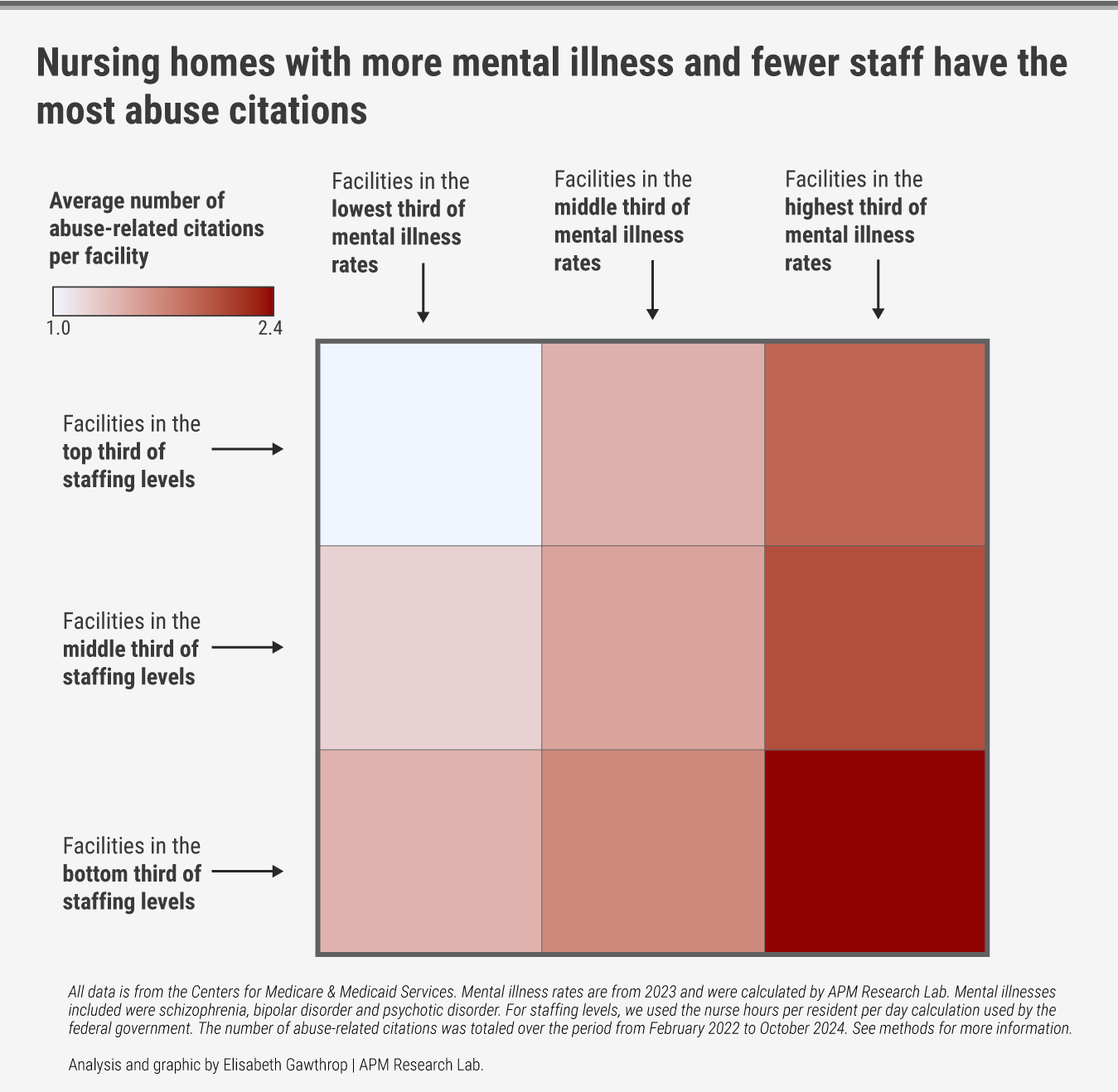 Data: Centers for Medicare & Medicaid Services. Residents with mental illness include those with a diagnosis of schizophrenia, bipolar disorder, psychotic disorder or a combination of those conditions. Serious mental illness percent and number of residents calculated for Dec. 31, 2023, by the APM Research Lab. Nurse staffing rating is the number of nurse hours per resident per day and is from January 2024. The number of abuse-related citations is totaled over the period from February 2022 to October 2024.