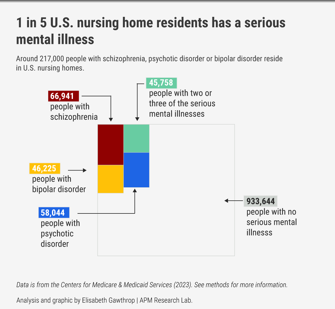 Roughly 1 in 5 nursing home residents nationally — a total of around 217,000 people — has a serious mental illness, according to an analysis of federal data by the APM Research Lab.