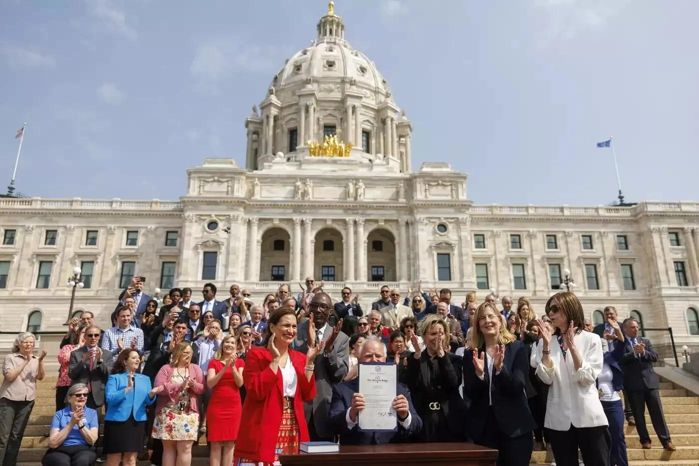 Gov. Tim Walz signed a piece of paper with his “One Minnesota” slogan meant to be representative of the new $72 billion state budget in May 2023, Lt. Gov. Flanagan appears on his right. Photo by Kerem Yücel| MPR News.